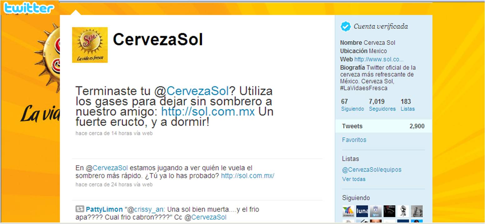 Cerveza Sol ha tenido gran aceptación por los facebookeros y twitteros mexicanos, tan solo en Facebook tiene más de 38 mil fans y en twitter más de 7 mil seguidores.